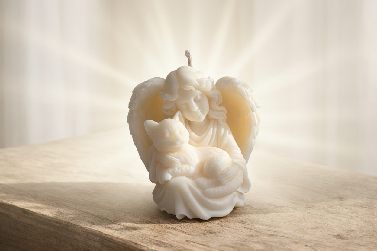 Engel Kerze mit Katze aus Rapswachs – handgemachte Gedenkkerze für verstorbene Haustiere